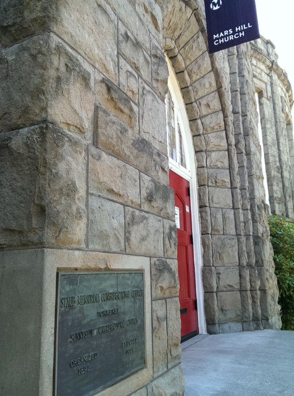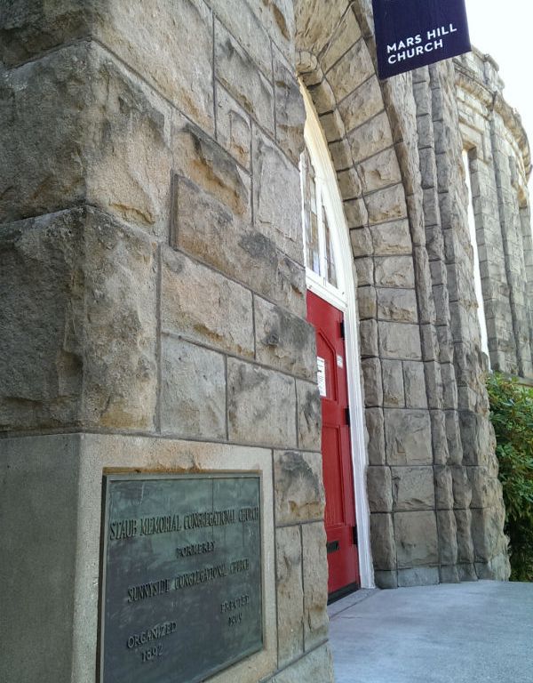 Sure, it’s easy to pick on the big guy. And Mars Hill is a big guy. But what’s noteworthy here is the other sign. “Staub Congregational Church” sat on this corner for almost 100 years. Were they faithful? Were they fruitful? I don’t know. But I wonder how the essence of Staub Congregational is likened to the essence of Mars Hill. More noteworthy is this building’s proximity to where I am now serving: 5 blocks. We also have a big stone church on the corner in the neighborhood. What will become of us? Who knows?
